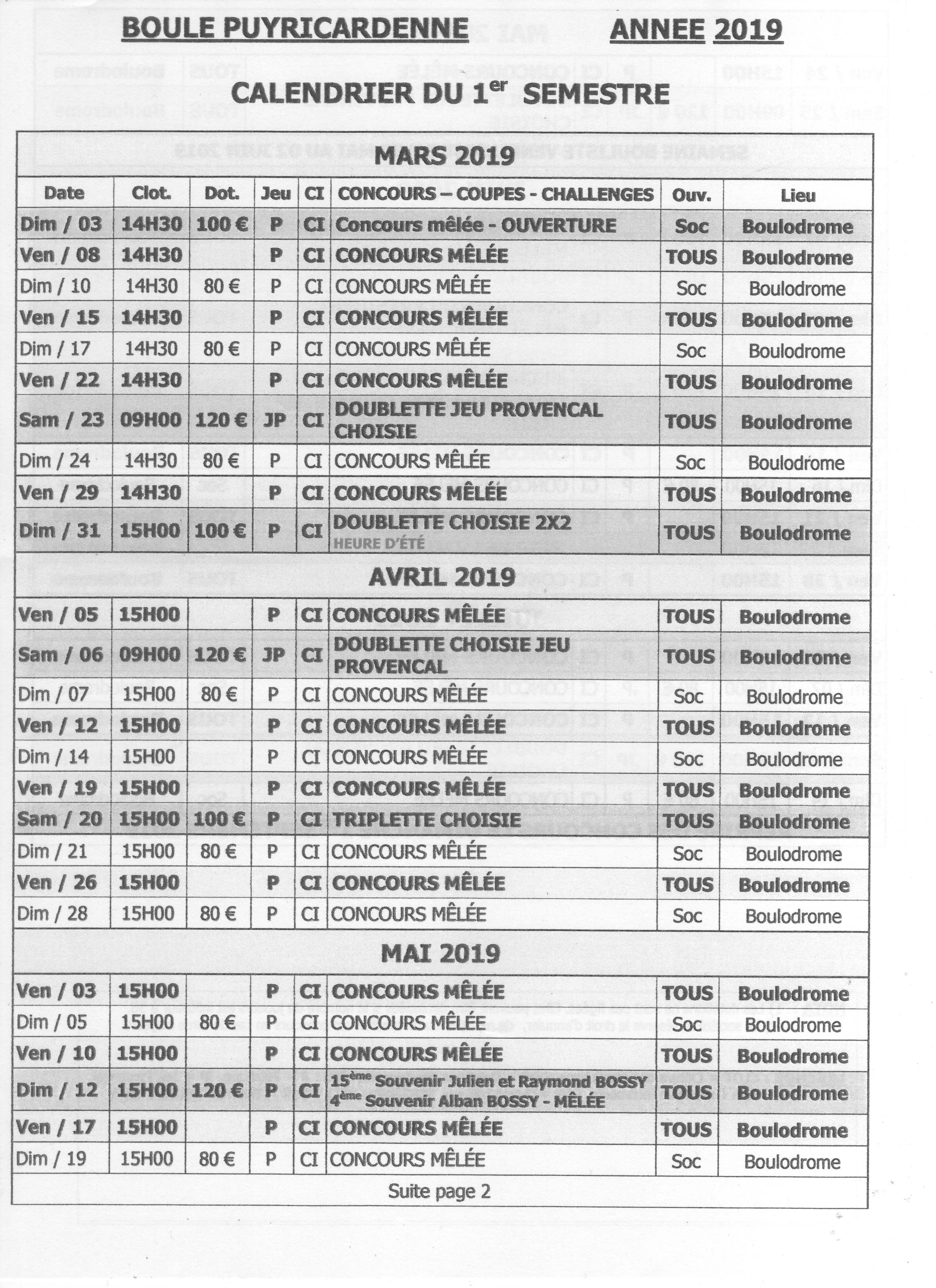 Calendrier du 1er semestre 2019