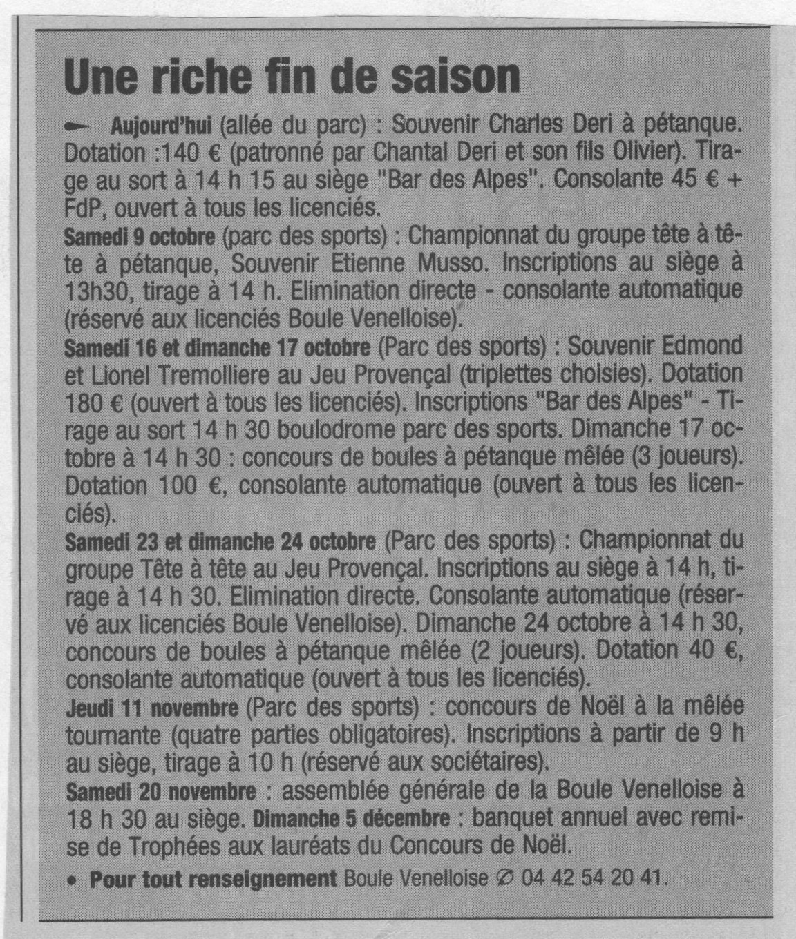 La disparition du champion bouliste venellois et président d'honneur de la Boule Venelloise ;