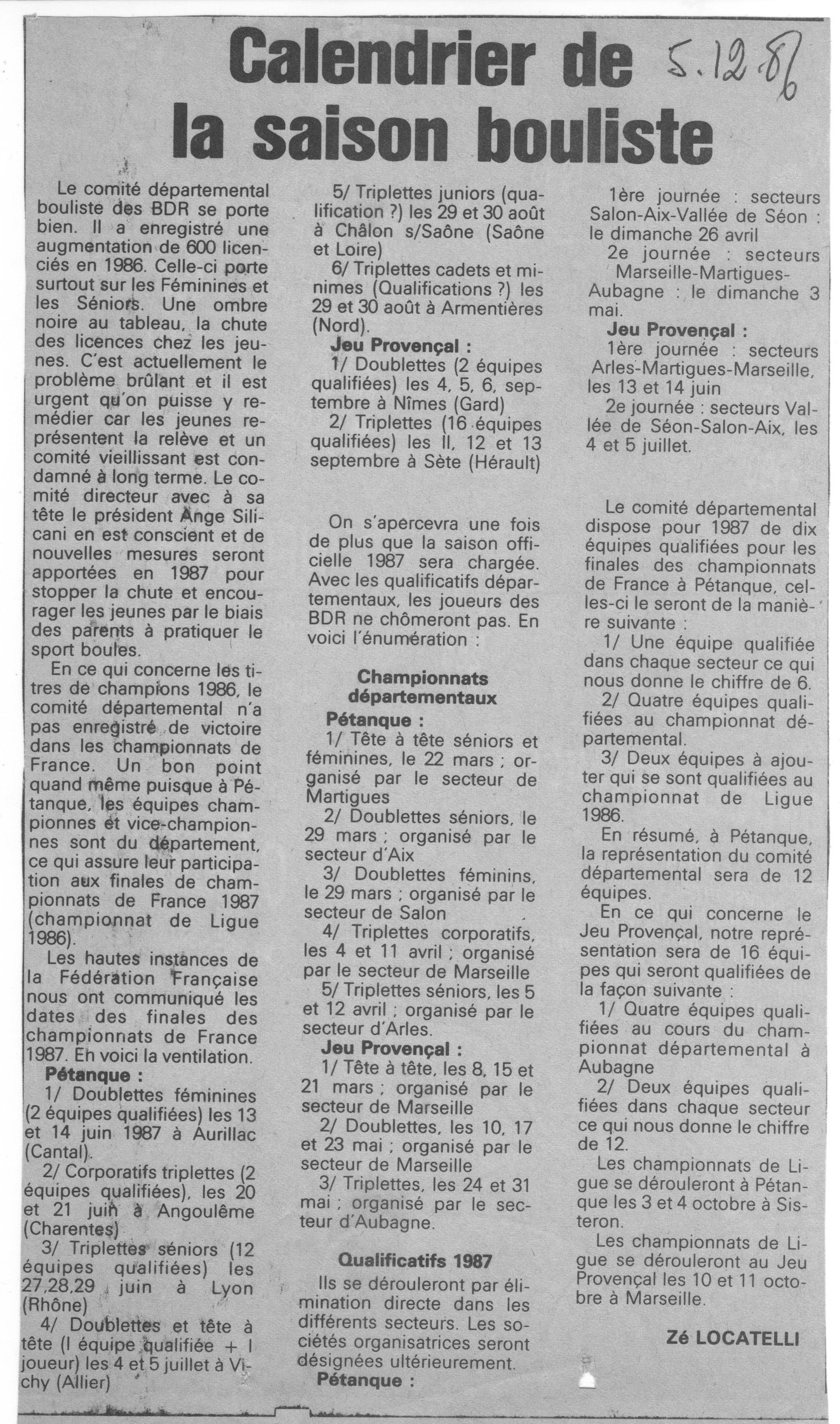 Le calendrier de la saison bouliste (de Zé Locatelli)