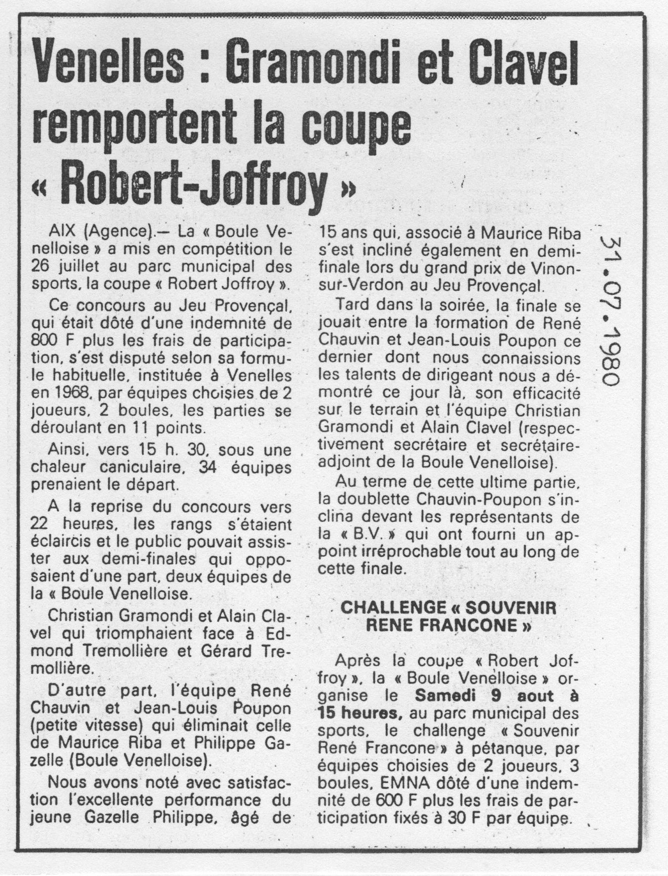 Victoire de Christian Gramondi et Alain Clavel (Boule Venelloise)
