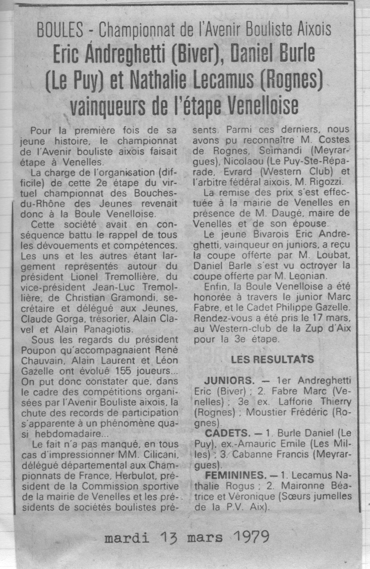 Dans la catégorie "Juniors", le jeune Marc Fabre (Boule Venelloise) se classe 2ème de l'étape ;