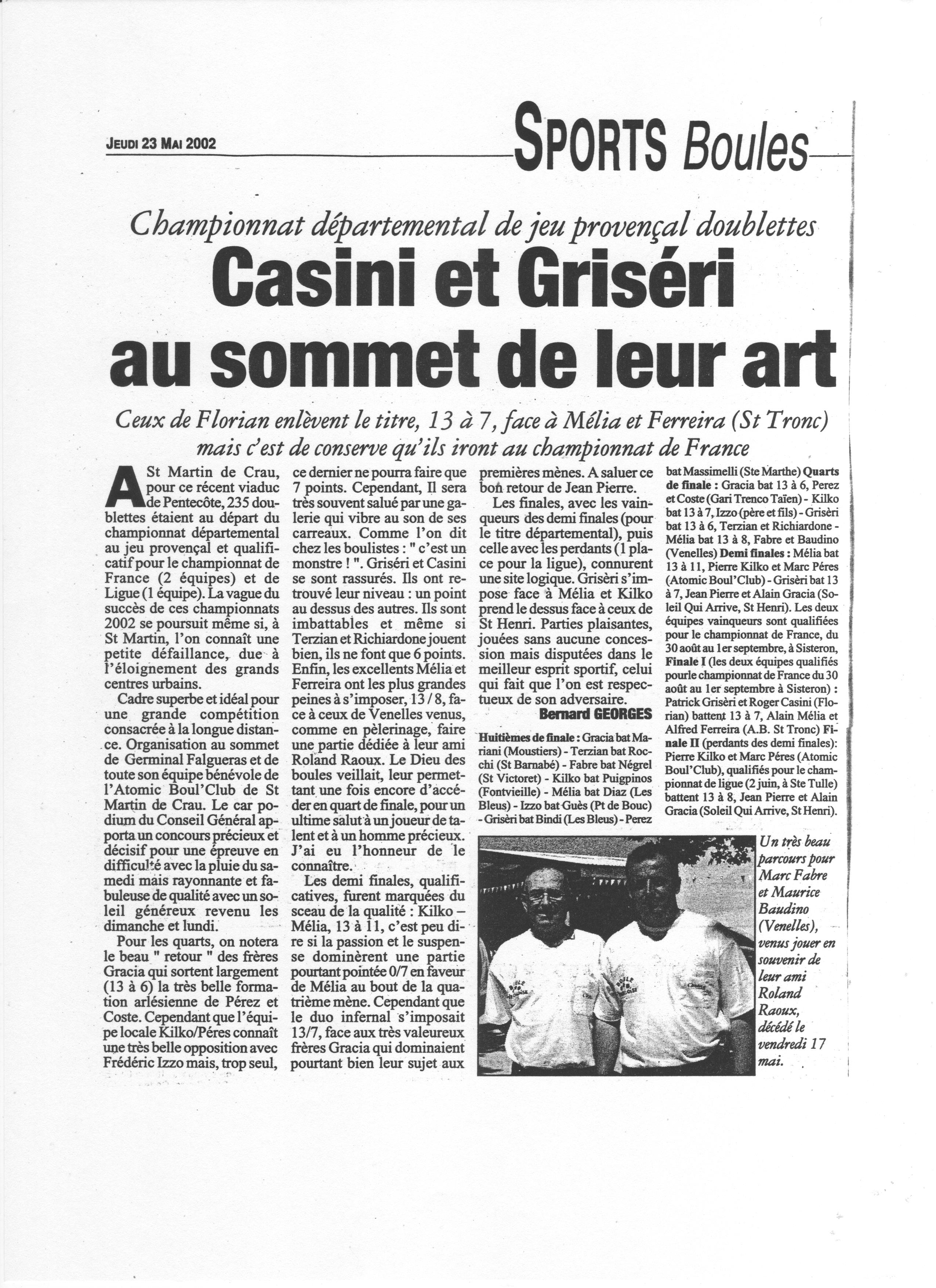 Bravo à Maurice Baudino et Marc Fabre pour leur parcours dans ce championnat. Ils s'inclinent pour la 2ème année consécutive en quart de finale de ce championnat.