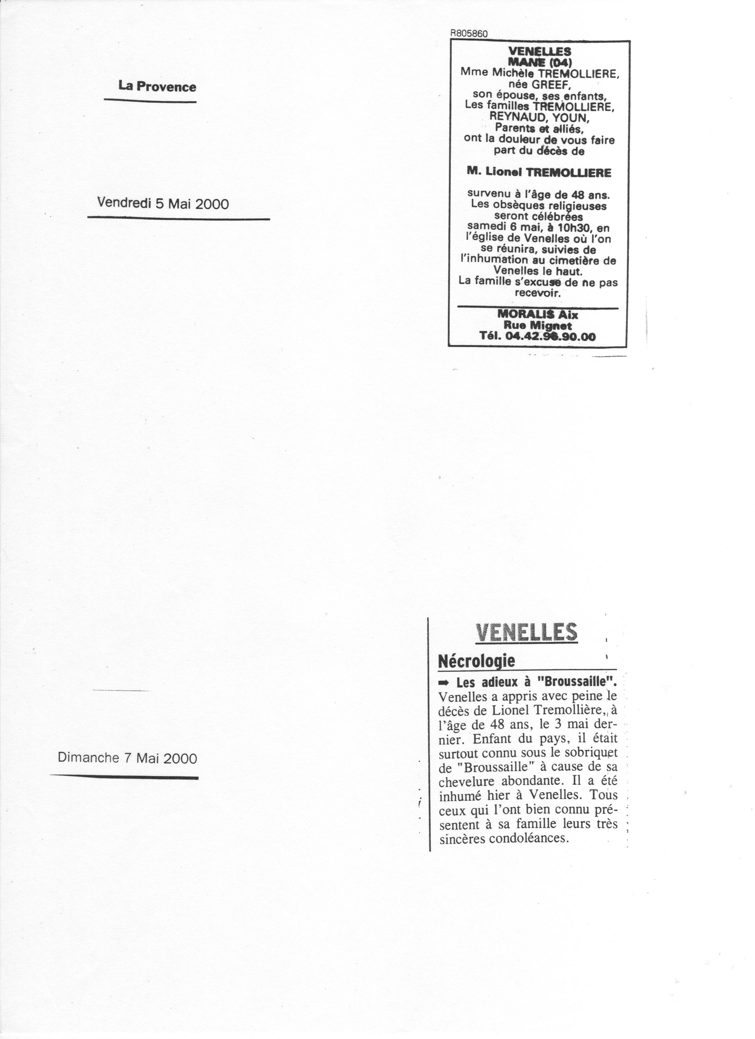 Avis de décès Lionel Trémollière (ancien président de la Boule Venelloise) ;