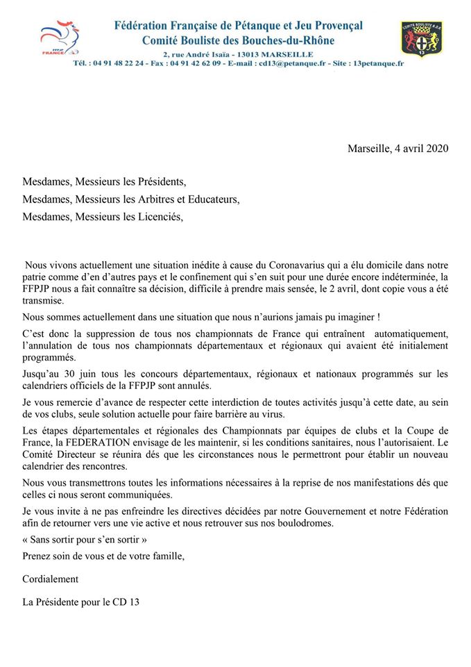 En pièce jointe, la copie du courrier de Madame la Présidente du Comité Bouliste des Bouches-du-Rhône en date du 4 avril 2020 qui nous informe de l'annulation de toutes les compétitions boulistes programmées jusqu'au 30 juin 2020.