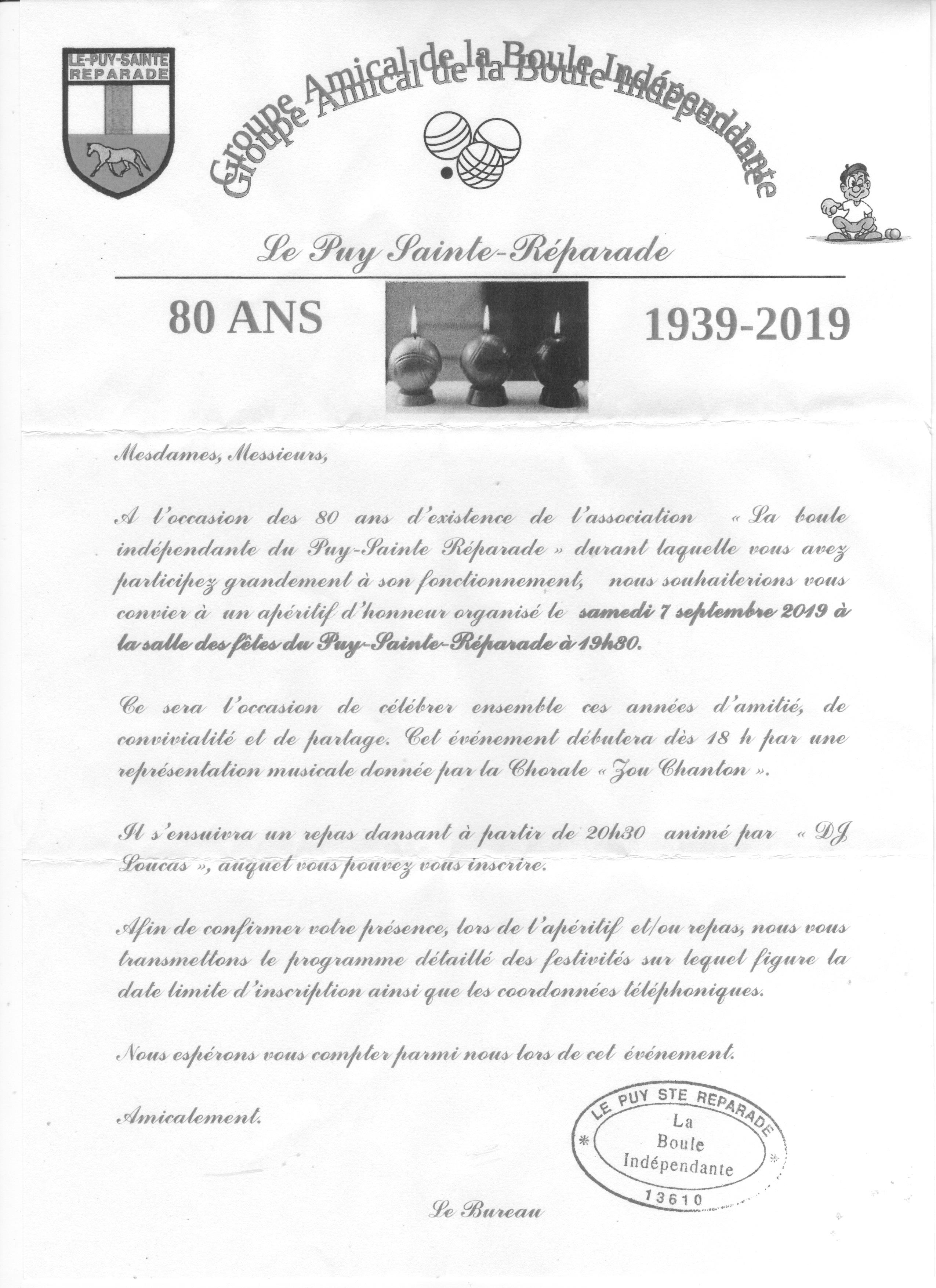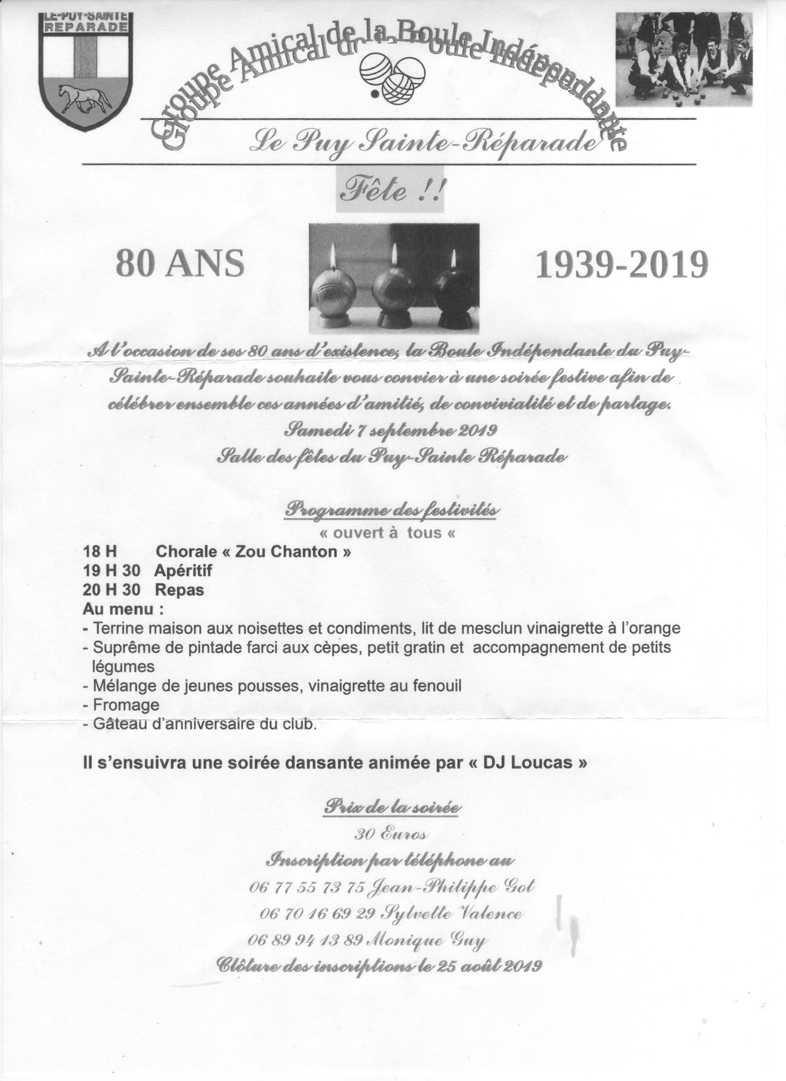 A l'occasion du 80ème anniversaire de sa création, "La Boule Indépendante du Puy Sainte-Réparade" organise une soirée dansante dans la salle des fêtes du Puy Sainte-Réparade,