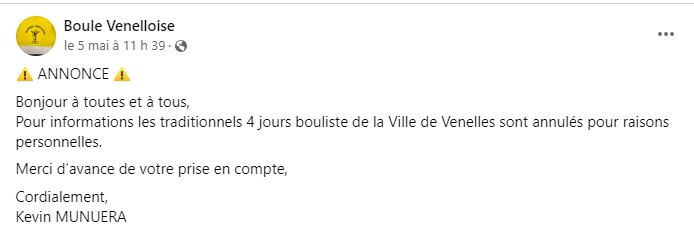 En pièce jointe, la copie du message publié sur le site facebook de la "Boule Venelloise".