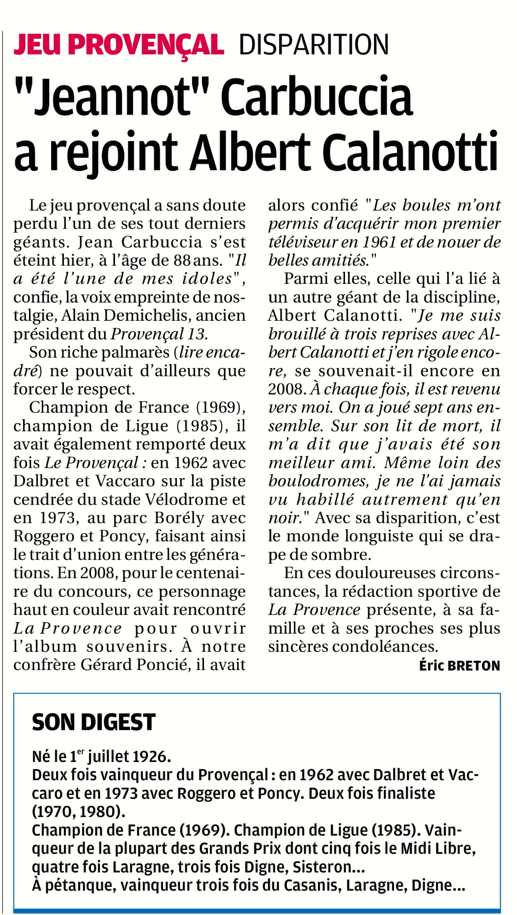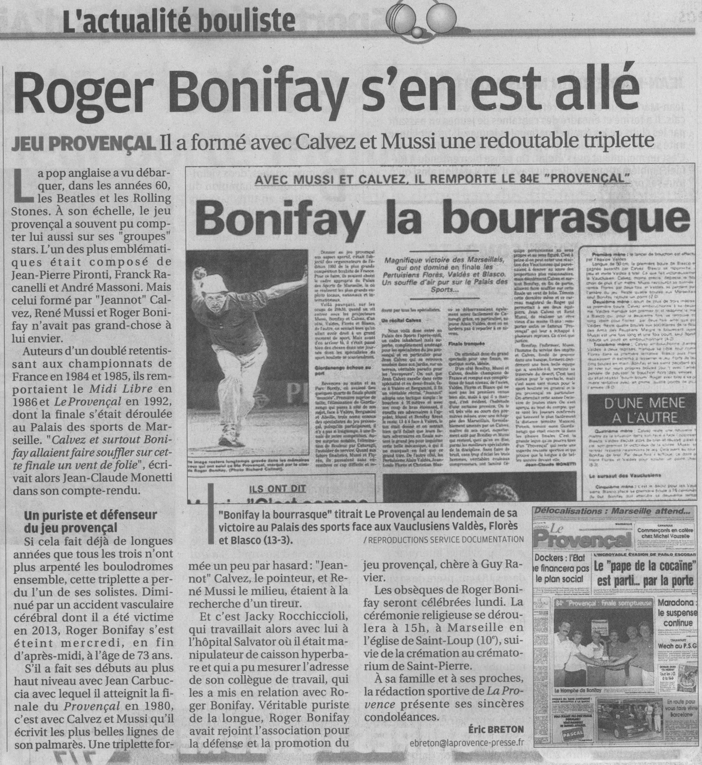 Article d'Eric Breton (quotidien La Provence) du 12 janvier 2015 :