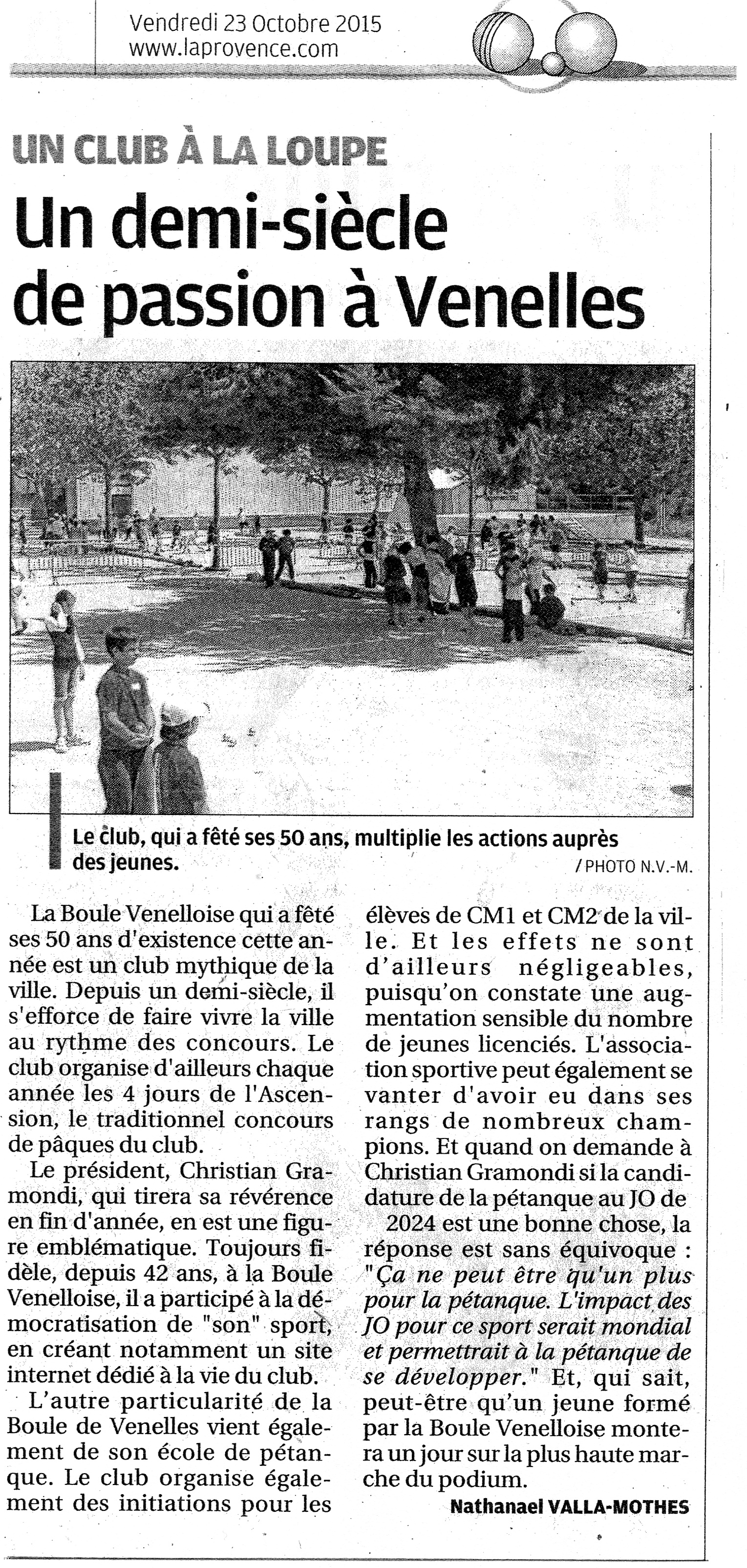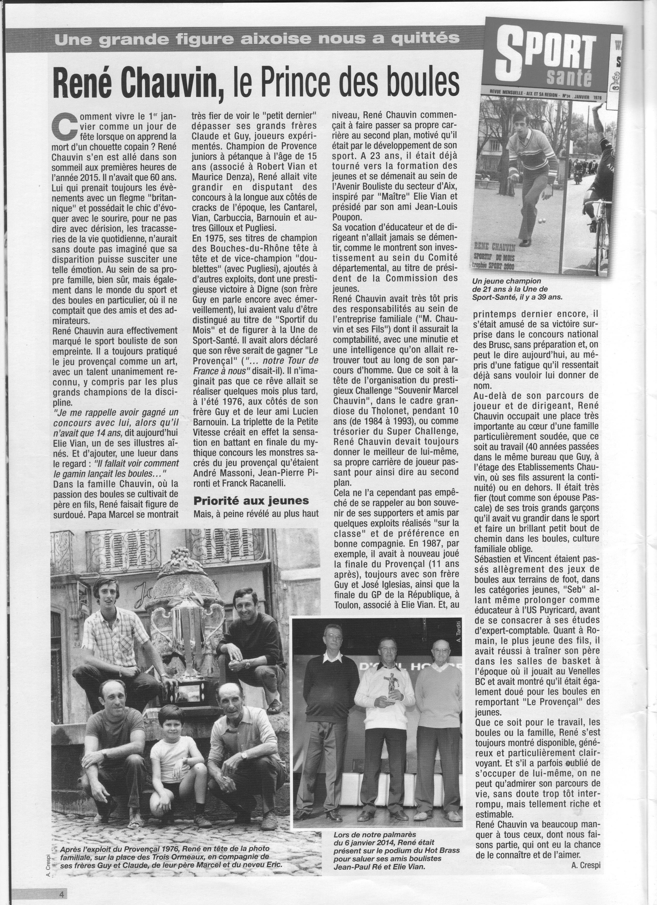 En pièce jointe, l'article d'Antoine Crespi, directeur de la publication du bimestriel du sport aixois, en hommage à René CHAUVIN, disparu en tout début d'année. René, champion bouliste aixois était un grand ami de Venelles, des venellois, de la Boule Venelloise et de ses dirigeants. Sa disparition va créer un immense vide dans le monde bouliste.