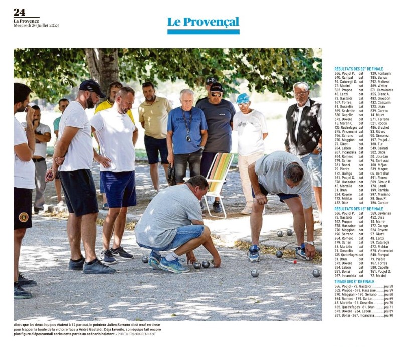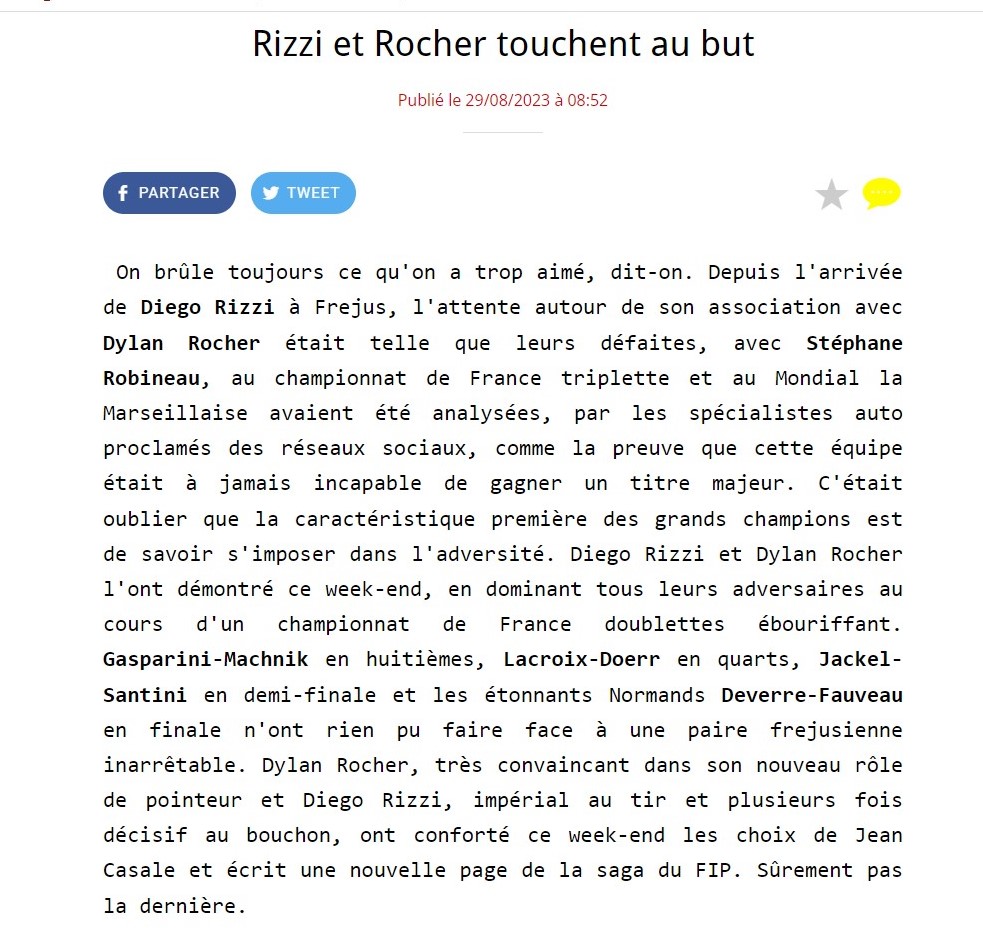 Les deux joueurs varois ont produit un niveau de jeu tout à fait exceptionnel. En finale, Diego RIZZI a fait du 100 %, 17 boules frappées sur 17 boules tirées (dont 5 carreaux et un but) et la dernière mène 3 boules pointées, 3 points ajoutés. Dylan ROCHER, 2 boules tirées et frappées dont 1 carreau.