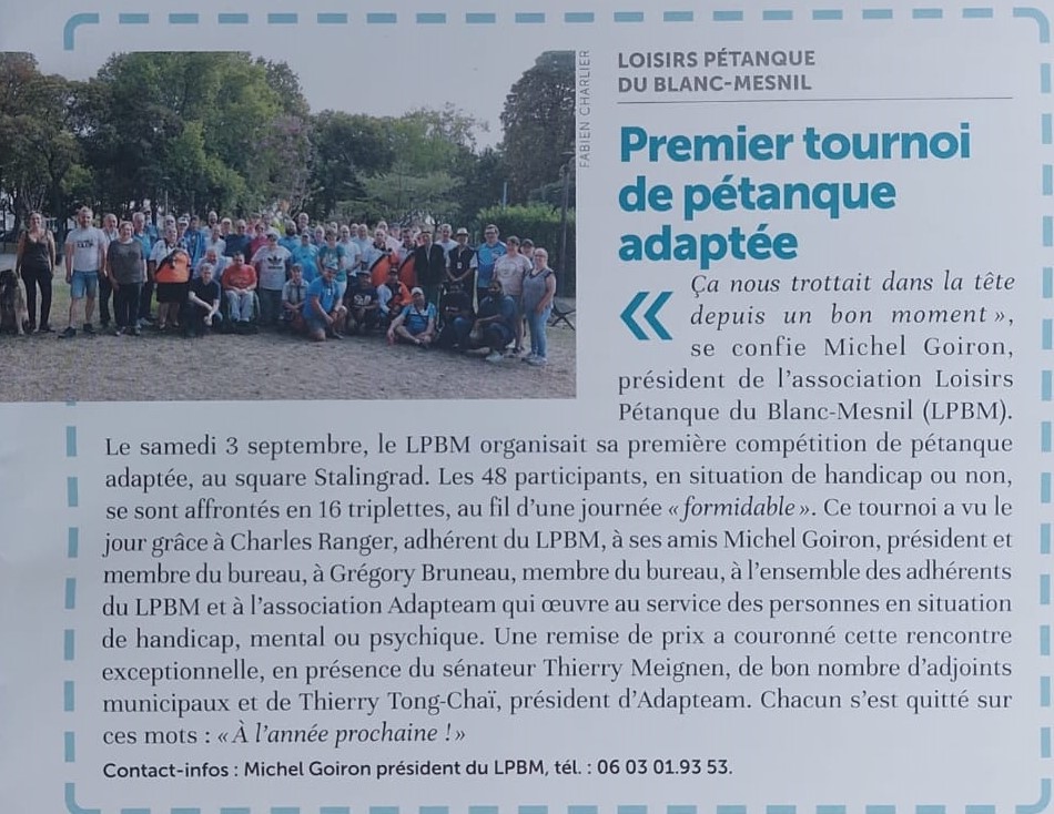 Charles Ranger membre de l'association LPBM à Le Blanc-Mesnil (93), lui tenait à cœur de créer un tournoi de pétanque sport adapté depuis quelques années. Ce fut fait ce samedi 3 septembre sous un soleil radieux, grâce à ses amis Michel Goiron, Grégory Bruneau, l'ensemble des membres du bureau et des adhérents de cette même association.