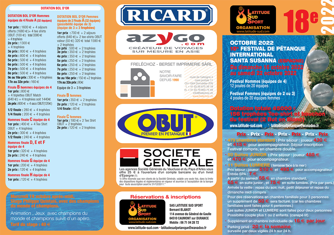 Le club organise une sortie pétanque pour le concours de SANTA SUSANNA (Espagne) du 16 au 22 octobre 2022.