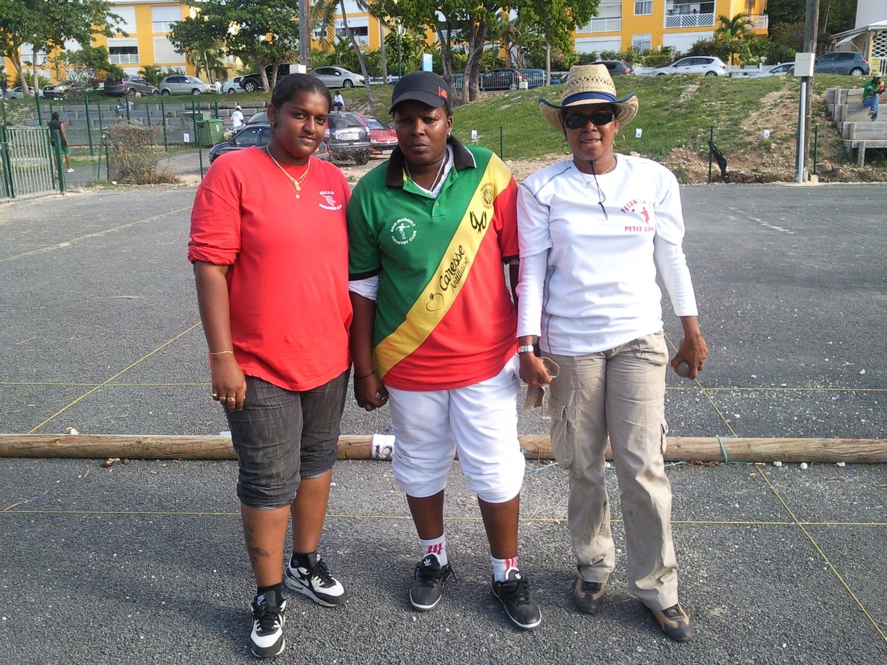 Marie-Françoise( Pétanque-Club de PETIT-CANAL), maillot blanc, Championne 2012 en Compagnie de Sandrine la Vice-Championne(B.M.C.C)et Saïda ( CACAO, CAPESTERRE), jeune très prometteuse qui était à sa première participation.