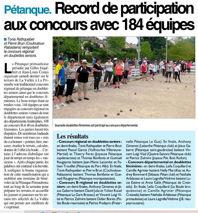 Tous les mercedis après-midi, les Papy's Pétanqueurs Primaubois organisent un concours en 4 parties à la mêlée. En moyenne plus de 70 joueurs s'affrontent dans la convivialité.