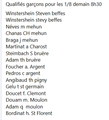 En huitième Quentin, Christophe et Guillaume s'imposent contre Jean Braga, José De Castro et Nathan Chanas de Mehun et ils s'inclinent en quart contre Steven Winstersheim, Sébastien Zago et Théo Bertrand de Beffes.