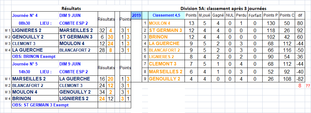 Prochaines journées, le 8 septembre: div. 1 à BRUERE, div. 2 à SAINT FLORENT, div. 3 à VIERZON (B.Y), div. 4 à CERBOIS, div. 5A à GENOUILLY, div. 5B et 5C à SAINT FLORENT, div. 1 et 2 féminines à SAINT DOULCHARD