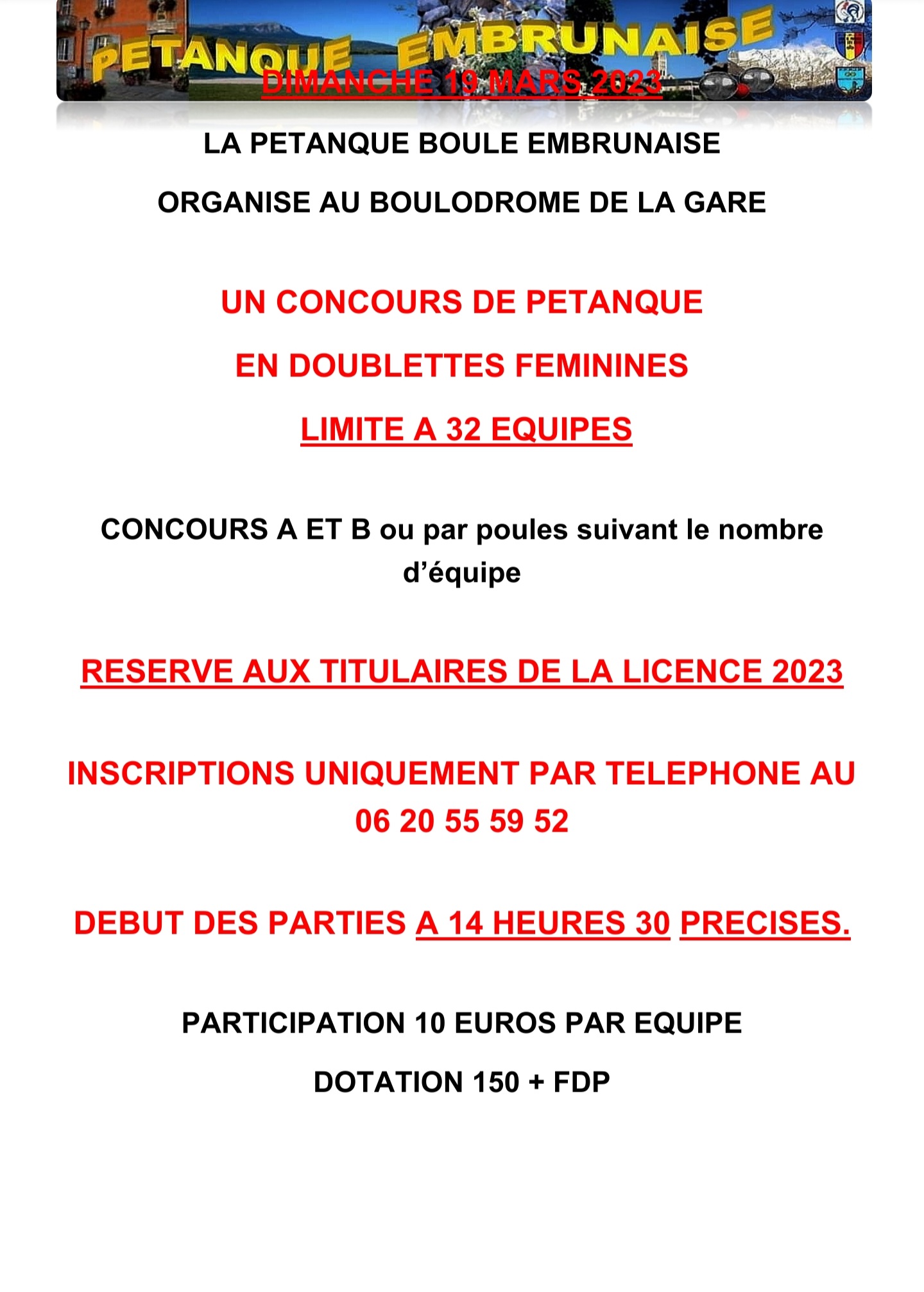 19 Mars : Doublettes féminines limité a 32 équipes / inscriptions au 06-20-55-59-52