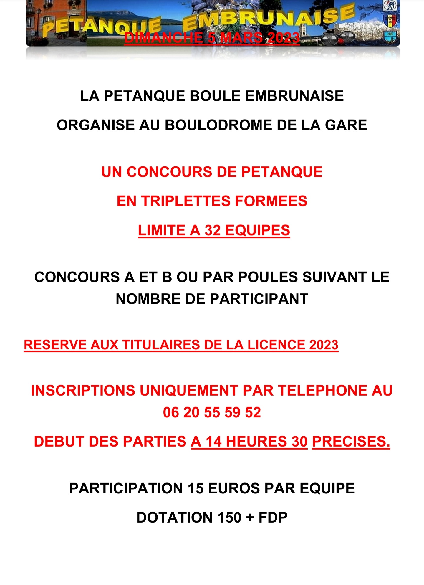 05 mars : Triplettes formées limité a 32 équipes / inscriptions au 06-20-55-59-52