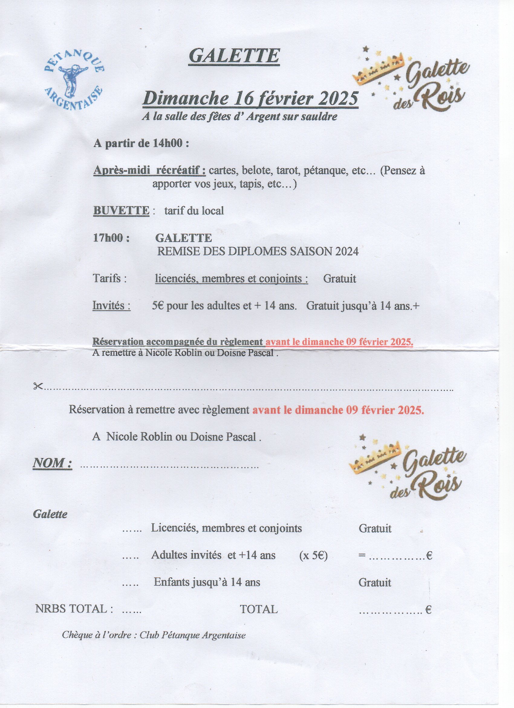 Réservation accompagnée du règlement avant le dimanche 09 février 2025.
