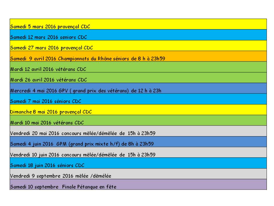 Pour rappel, nous participerons aux championnats : seniors, vétérans (2 équipes), provençal ainsi qu'à la coupe de France.
