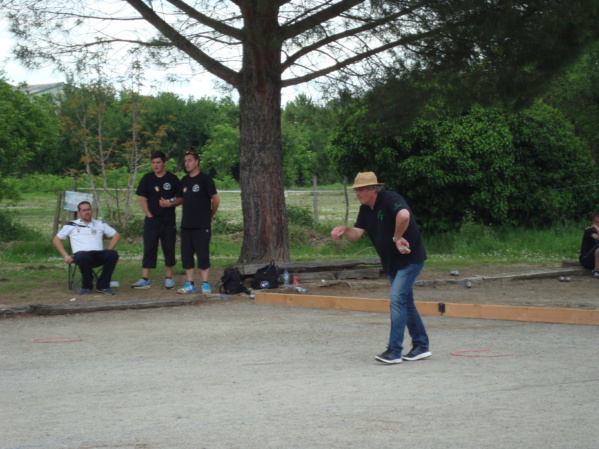Après une partie rapidement perdue 11 à 1 en début de journée, nos représentants reprenaient des couleurs et atteignaient la pause en menant 7 à 1 sur la seconde partie de poule. Repas trop lourd? Soleil trop chaud? toujours est il qu'à la reprise les débats s'équilibraient et qu'une ultime mène sur le score de 10 à 10 allait être déterminante. Il fallait un coup de "génie" (ou de "culards" comme diraient certains) d'André et une reprise de Philippe dans le bouchon à sa dernière boule pour faire la décision.