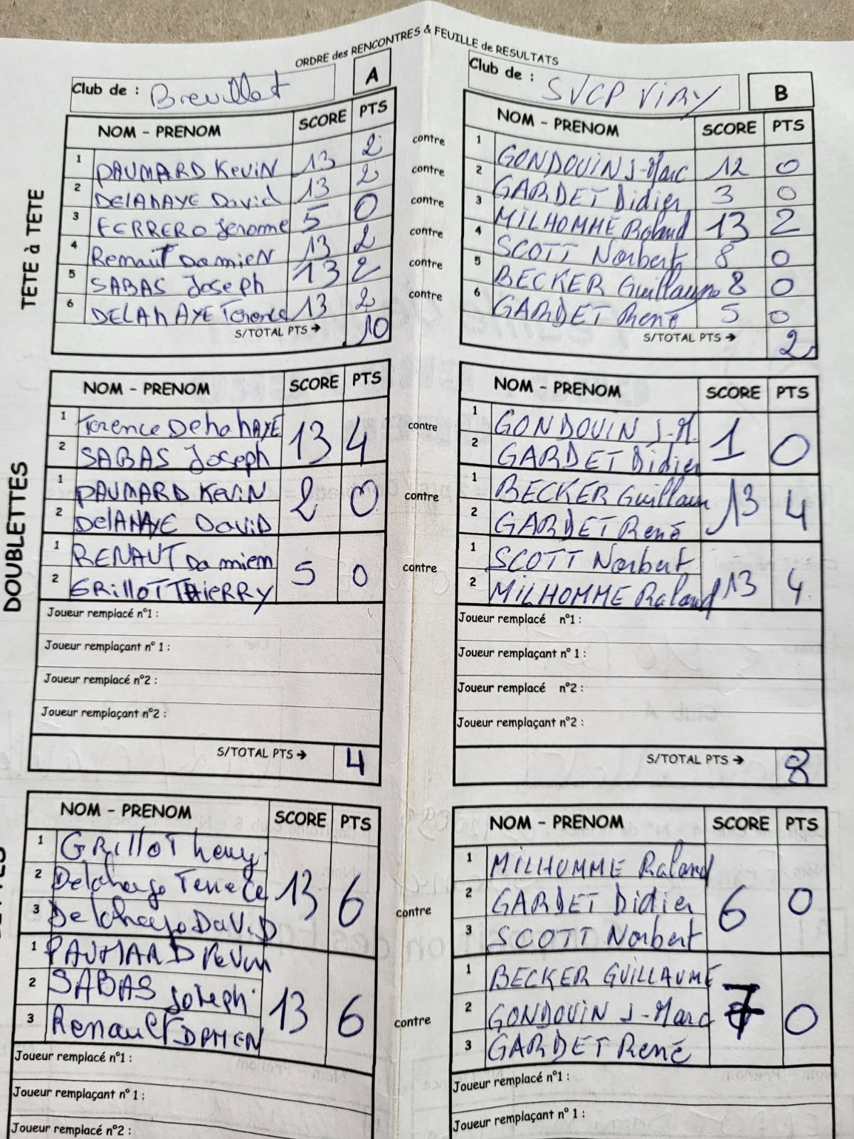 Même performance en doublette avec un deux sur trois honorable qui permettait à la SVCP de n'avoir à gagner qu'une triplette. Score : 16 à 8.