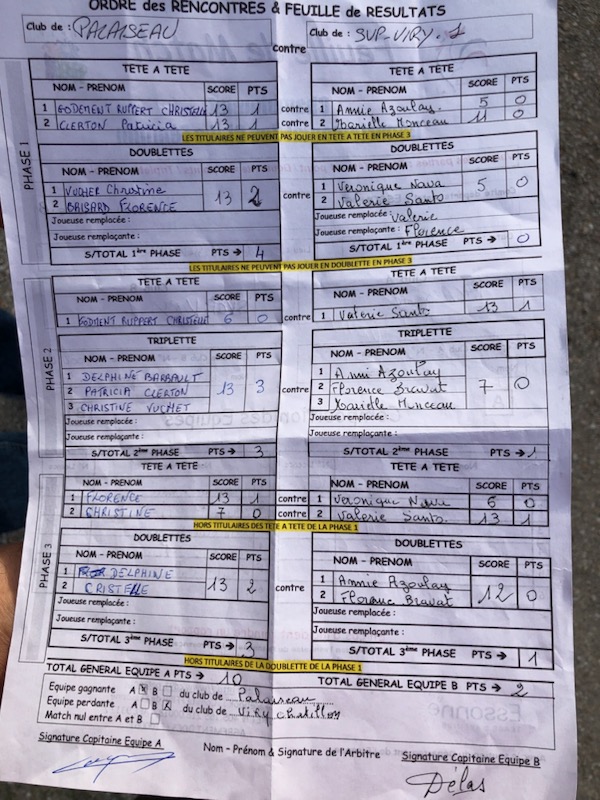 Évidemment, même un peu initié comprendra que la doublette supra aurait pu changer le sort du match car il s'agissait maintenant de gagner deux triplettes au lieu d'une pour poursuivre la route. Cet objectif n'était pas atteint et dès la première triplette perdue, la match s'arrêtait. Score final : 4 à 14.