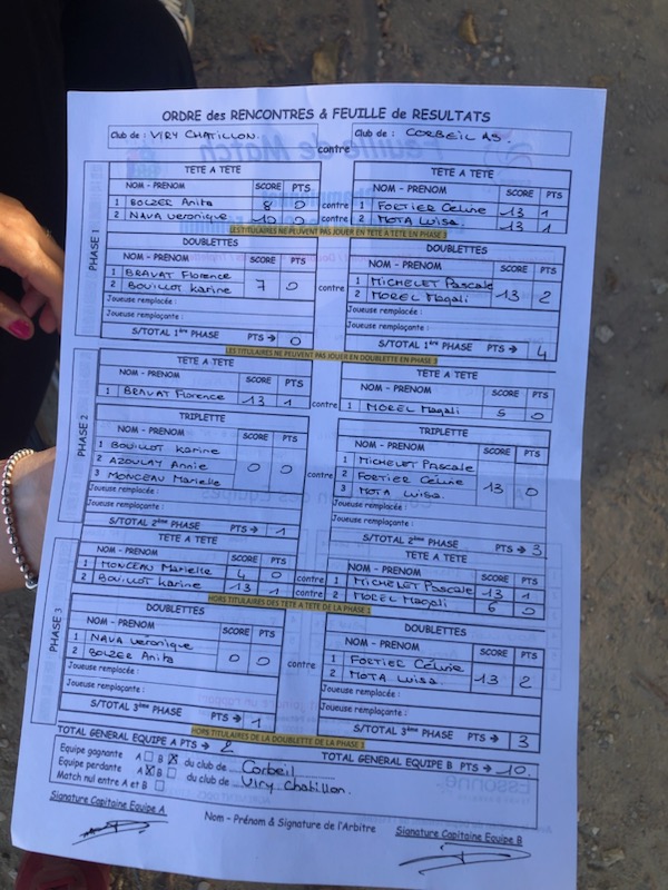 Phase 3 : un tête à tête remporté l'autre tête à tête perdu et la doublette pour Corbeil pour un score final de 2 à 10.