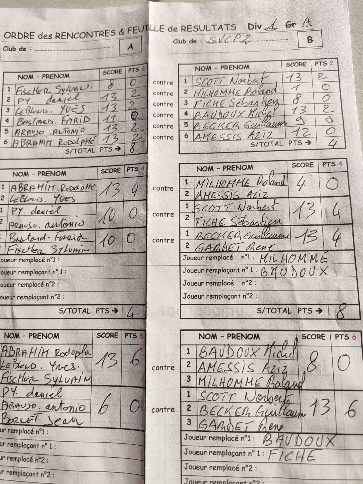 Phase 1 : capot sur cette première phase la SVCP, pas de victoire en individuel, pas de victoire en doublette. Mauvaise bière. Score : 0 à 4.