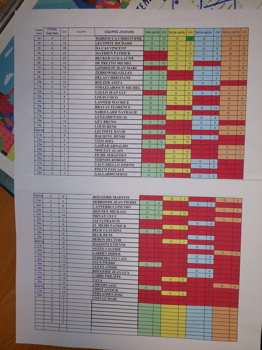 Météo un peu fraiche, pas de pluie - Préparation de la caisse, mise en place, Inscriptions, tirage des tours, tenue du graphique à la main, distribution des dotations et proclamation des résultats : René Gardet - Communication et achats pour le pot : Alain Fages - Buvette, préparation du Kir et du rosé pêche : Alain Petit - Gâteaux et friandises : Pascale Folco : chouchous, Annick Izanic : gâteau à l'ananas, gâteau aux pépites de chocolat, Éric Arino : roulé à l'abricot - Grand ménage post manifestation le mardi 12.11.2024) par Karine Bouillot et Christiane Délas.