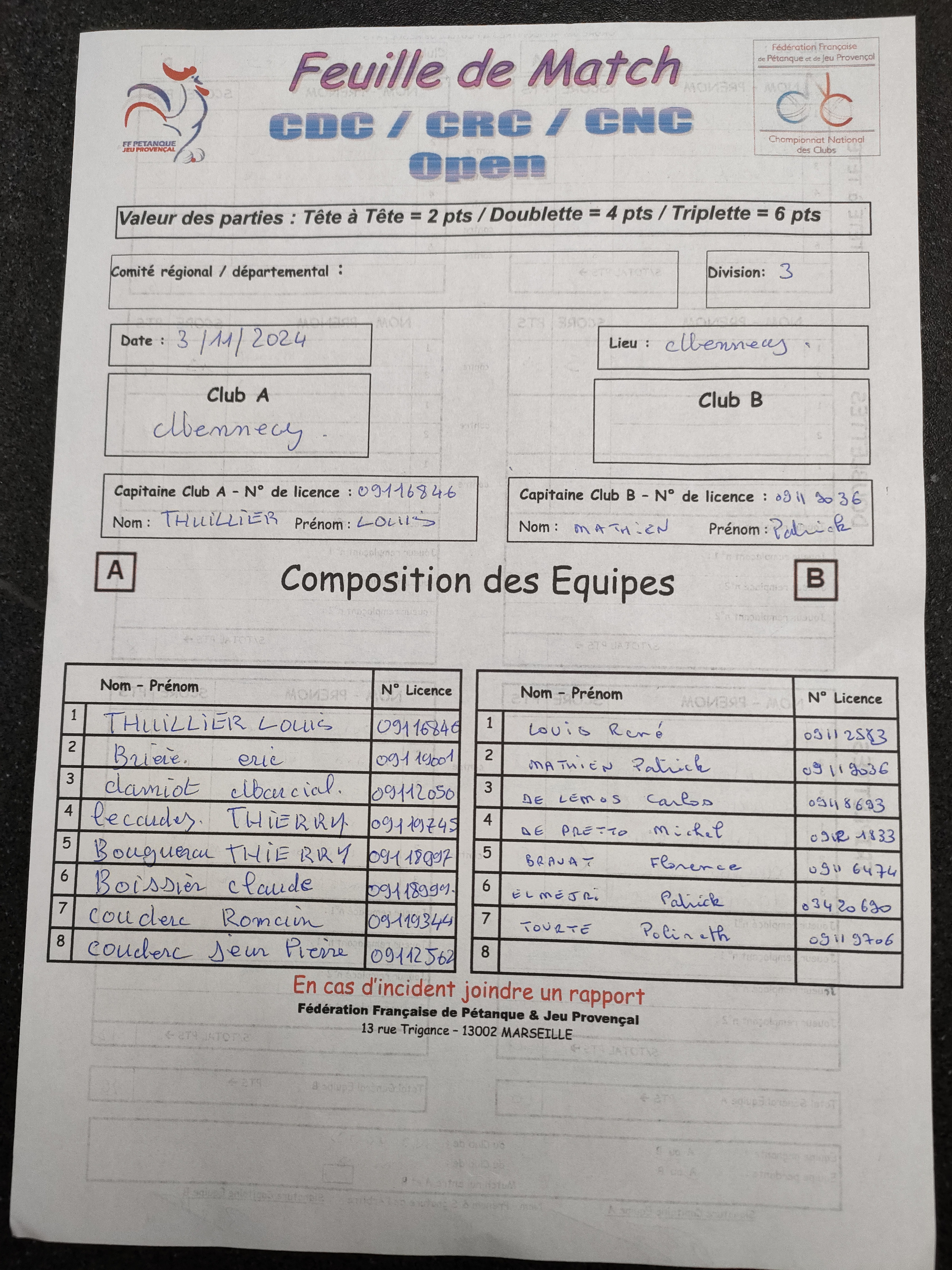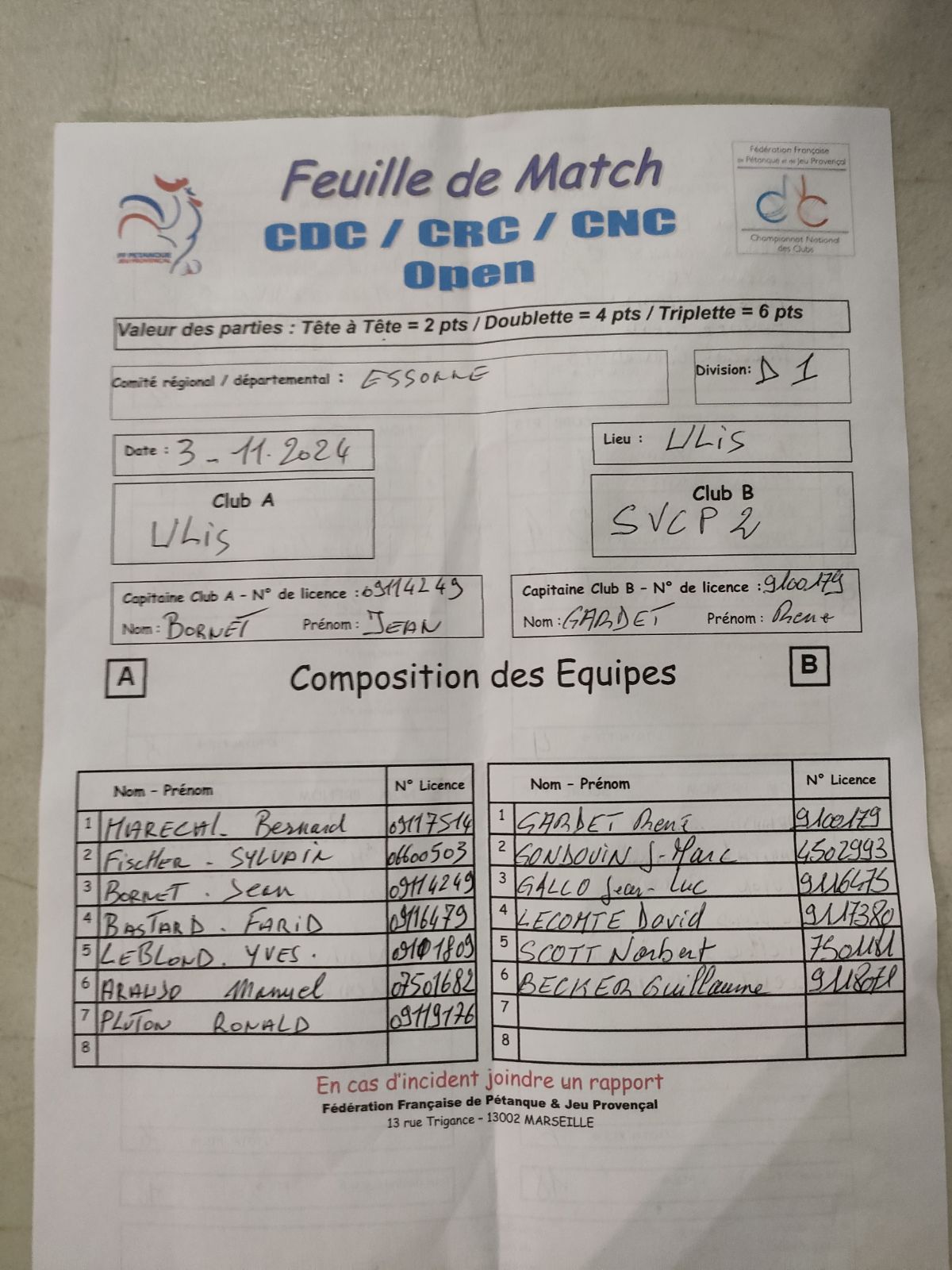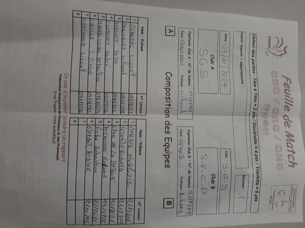 Feuille de match en PJ.