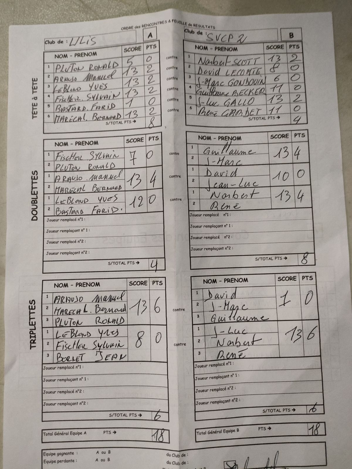Et la similitude entre les deux matchs se poursuivait, la SVCP remportant une triplette 13 à 10 pour obtenir le match nul ! Score : 18 à 18.