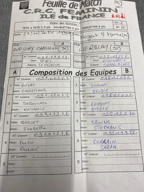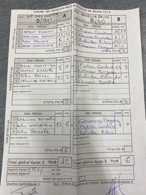 Mais elle faisait beaucoup mieux en s'imposant par la plus large des marges dans les deux rencontres en triplette. Score final : 30 à 6. Feuille de match en PJ.