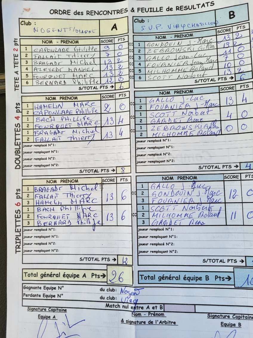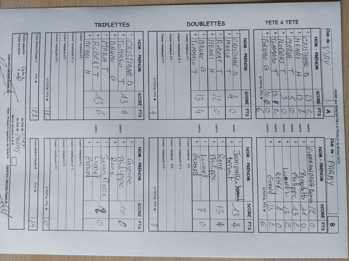 Les premières s'inclinaient de peu (à 10) contre une équipe de SGS tandis que les secondes ne parvenaient pas à venir à bout (9 à 13) des futures championnes de Brunoy Sauvageon. Vu le peu d'écart au score, ces deux triplettes n'étaient pas si loin des demi-finales, bravo !