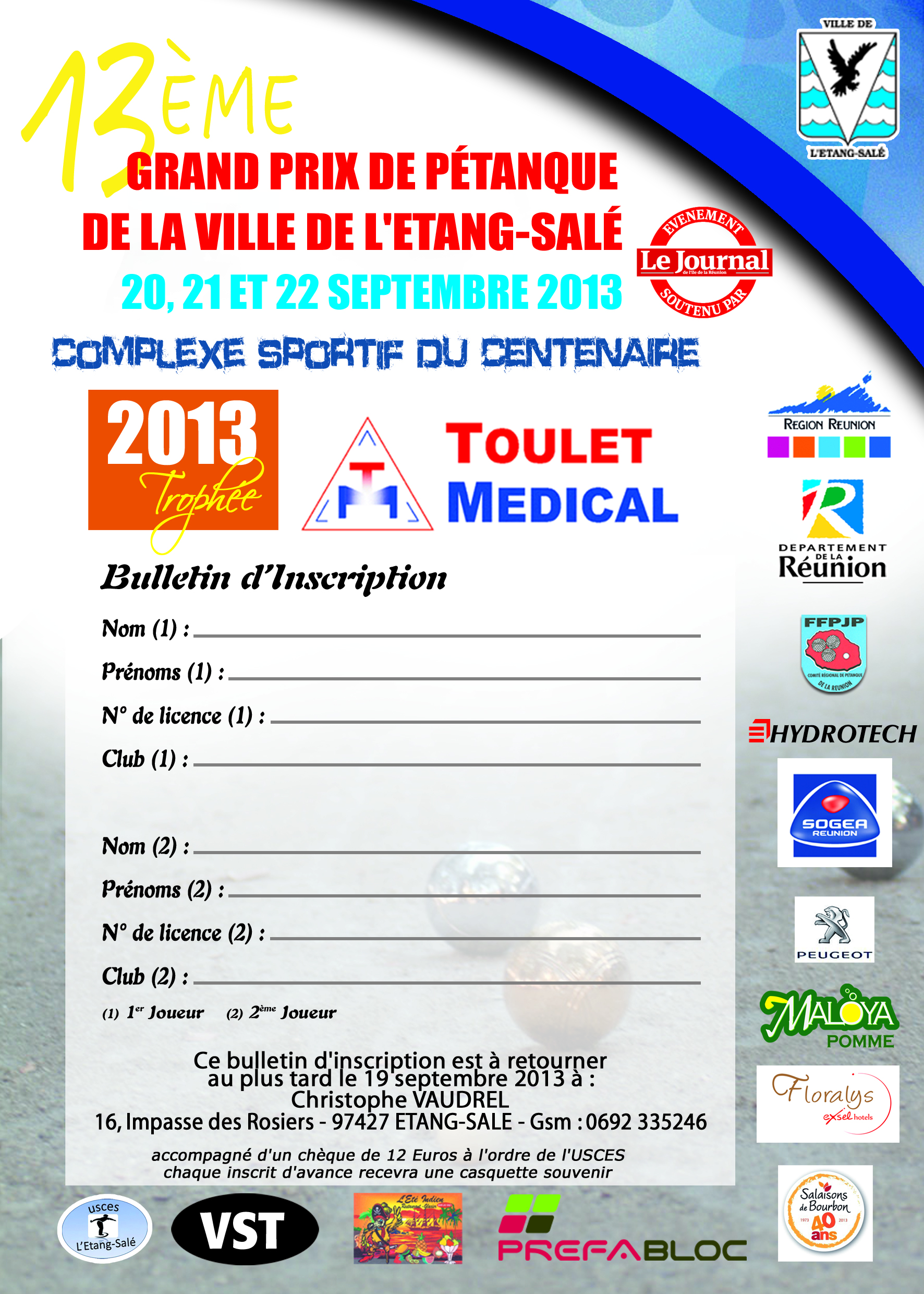 Pour les équipes intéressées, le bulletin d’inscription au 13é grand prix de l’Etang-Salé est en pièce jointe et peut être téléchargé. Il est à retourner au plus tard le jeudi 19 septembre. Il est également disponible dans le JOURNAL DE L’ILE. Chaque équipe inscrite d’avance recevra deux casquettes souvenir et c’est aussi un bon moyen de ne pas être stressé par un éventuel retard.