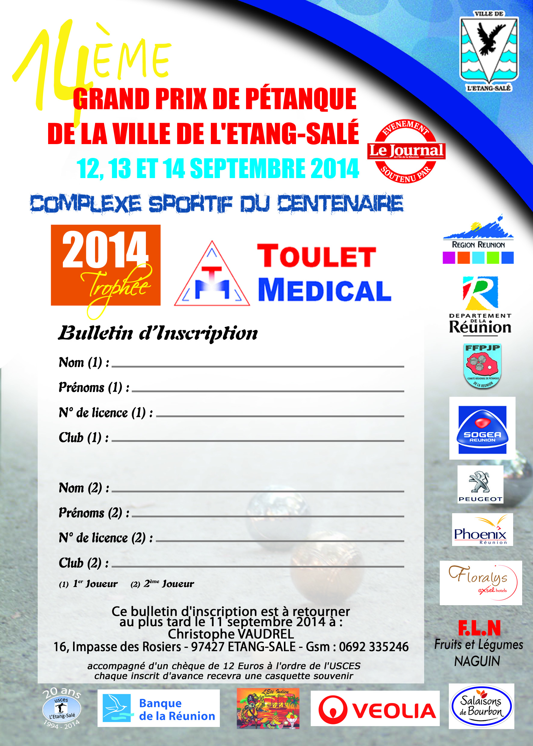 Voilà les dernières informations concernant la 14éme édition du grand prix de l’Etang-Salé – Trophée Toulet Médical -. N’hésitez pas à venir faire un tour du côté du Stade et nous espérons que vous passerez un moment inoubliable en découvrant des champions de pétanque et profiter pleinement des animations proposées.