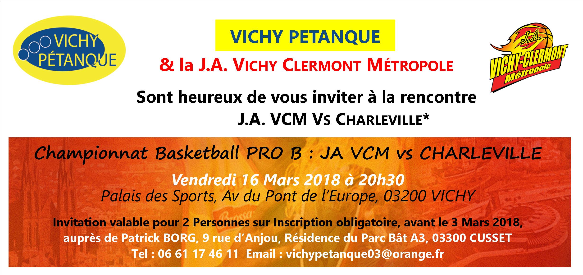 Comme je vous l'ai dit lors de la dernière réunion ,nous sommes tous invités par la JAVMC à assister au match de basket qui se déroulera le 16 mars 2018 contre Charleville au Palais des Sports de Vichy , Avenue Pierre Coulon ( Centre Omnisports).