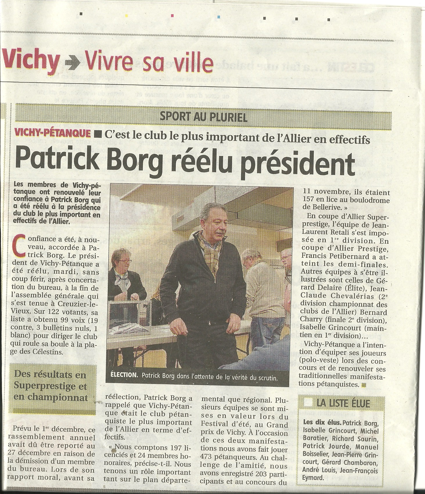 Patrick BORG , Isabelle GRINCOURT , Michel BARATIER, Richard SAURIN, Patrick JOURDE, Manuel BOISSELIER, Jean Pierre GRINCOURT, Gérard CHAMBARON, André LOUIS et Jean François EYMARD qui l'emporte avec 99 bulletins contre 19 , 1 blanc et 3 Nuls
