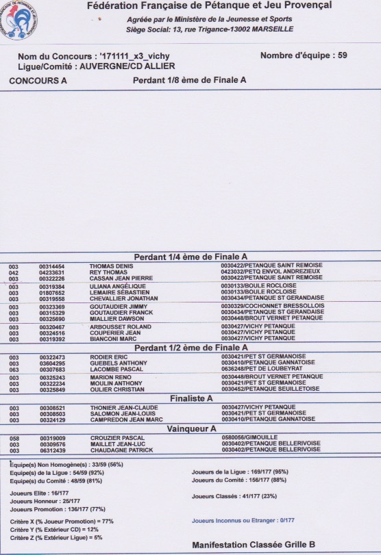 Voici les résultats du concours du 11 Novembre 2017 organisé par Vichy Pétanque au Boulodrome .